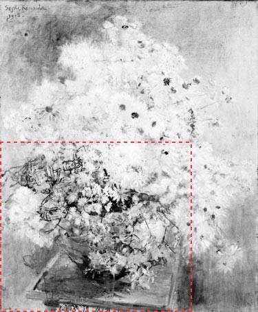 <赤外線有りで撮影>点線の部分に別の下絵があることが確認できる。 |